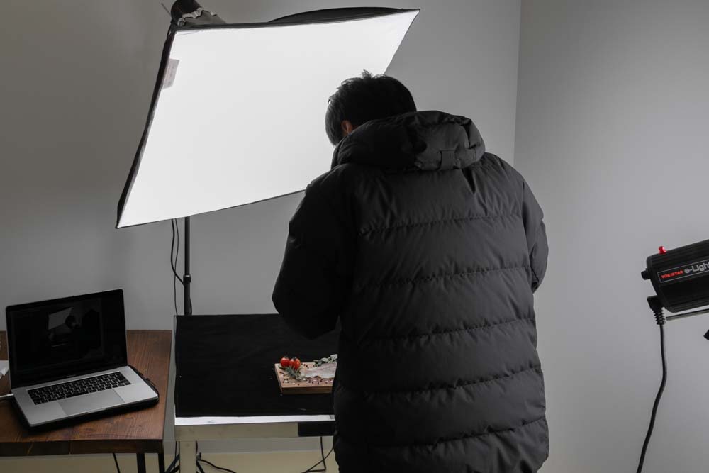 肉が痛まないように、室内は冷房を効かせているので、ダウンジャケットを着ての撮影でした。