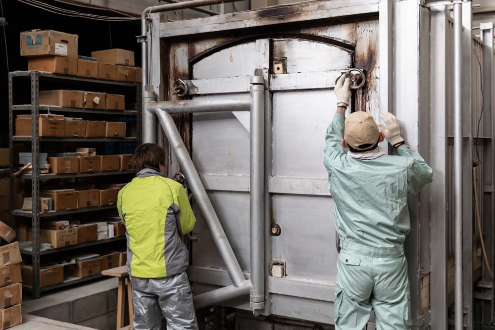 宮越製砥株式会社様のホームページ撮影。前回の撮影から三日目の朝。 早朝、熟成させた砥石を焼成炉から取り出します。前回、撮影した日の夜に火を止めていますが、砥石には熱が残っていて、まだ熱い。 社長様は、砥石を耳に当てて、指...
