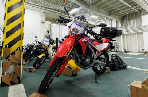 大阪南港から出港したオレンジフェリーは、早朝、愛媛県東予港に到着し、そこから西へ100kmほど走って、大洲市の肱川河川敷広場へ。ここがメイン会場となり、前日の車検を受けました。会場には全国から、オフロードバイク、アドベン...